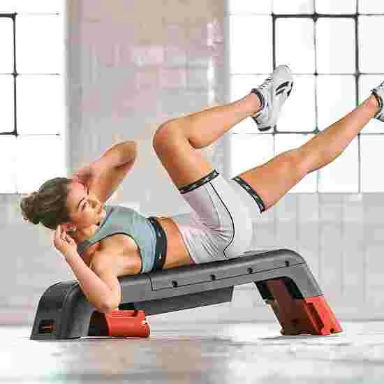 Step and workout bench in one. Two levels of height adjustment (20 and 35Â cm) and four different backrest positions (flat bench, incline bench and seat). Internal storage compartment for small fitness products. Comes fully assembled. Easy to clean, moisture-resistant and hard-wearing. 70% PP, 11.5% TPR, 10% iron, 7% nylon and 1.5% ABS. LxWxH: 121.5×33.7×35Â cm. 12.4Â kg. Max. load: 150Â kg.