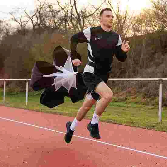 The Vinex “Premium” speed chute is made of polyester, making it particularly light. Using the sprint parachute, you can strengthen your leg muscles and thus increase acceleration, explosiveness and speed. No need for a training partner to use the chute. The padded, size-adjustable hip belt connects the runner with the parachute. This in turn increases the air resistance by approx. 10–15 kg, depending on the running speed.